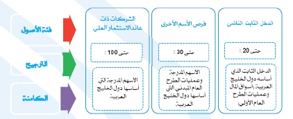 - يقوم الصندوق بالاستثمار في الأسهم الخليجية التي تحقق عوائد أرباح أعلى من المتوسط )عائد توزيعات الأرباح لكل من الألأسواق الخل​يجية على النحو الوارد على موقع Zawaya.com، مما يعني أن الأسهم المؤهلة للاستثمار فيهاهي أسهم الشركات المدرجة بأسواق المال الإقليمية وهي الأسهم التي تحقق معدلات أعلى من المتوسط على أساس مستدام، وتعرف بأنها أسهم ذات عوائد مرتفعة. يتمثل المنطق وراء هذه الاستراتيجية للاستثمار في أن الشركاتالتي يمكن أن تحافظ على معدلات أرباح أعلى، يمكنها عموما توفير فرص مستقرة للمستثمر. يهدف الصندوق إلى نسبة مئوية قدرها 100٪ من صافي قيمة الأصول من التعرض لأسهم الشركات المدرجة بدول مجلس التعاون الخليجي التي تقدم عائد ربحي. بطبيعة الحال، فإن تلك الشركات الموزعة لأرباح لديها تدفقات نقدية مستقرة،ودخل ثابت أو متزايد مع عائد مرتفع على الأسهم وميزانيات عمومية سليمة .